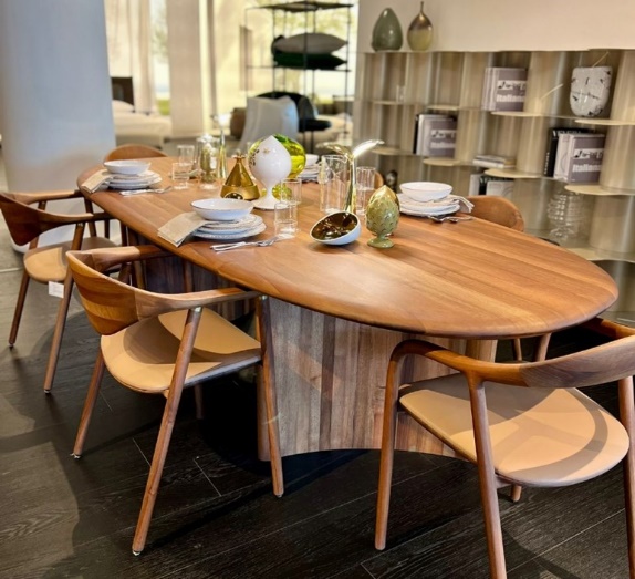 - الخشب: يبرز الخشب كعنصر محوري هذا الموسم، حيث تسلط ناتوزي إيطاليا الضوء على الألوان الدافئة لجذوع الجوز الصلب في قطع مثل طاولتي الطعام مونومنت (Monument) ويوراغانو (Uragano). تضيف أنماط الجوز الطبيعية عمقًا ودفئًا، بينما تضفي الألواح الزجاجية الشفافة لمسة عصرية تخلق توازنًا بين التقاليد والحداثة.