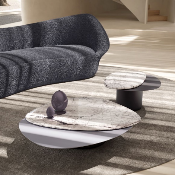 - الرخام: يبقى الرخام رمزًا للفخامة، وخاصةً في مجموعة طاولات القهوة سبلاش (Splash) المستوحاة من انسيابية الماء. تجمع هذه المجموعة بين الأشكال العضوية والمواد النبيلة مثل رخام ليلاك (Lilac) وفولاكاس (Volakas) وكلكتا الأخضر (Calacatta Green)، لتعكس الحركة والتدفق الطبيعي.